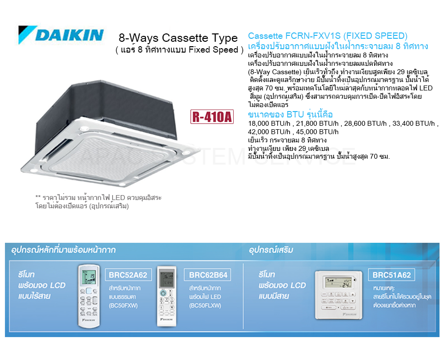 ![]() "หมวด: ราคาแอร์ 4ทิศทาง แอร์เป่าสี่ทิศทาง (Cassette Ceiling Type) "แอร์เป่าลม 4ทิศทาง นิยมใช้กับพื้นที่ที่มีขนาดใหญ่ เช่น ออฟฟิศที่ไม่ได้มีการกั้นแยกห้อง,โถงต้อนรับที่มีระดับความสูงของฝ้าที่ไม่สูงมากนัก (ไม่เกิน 4 เมตร) ห้องรับแขก (living room) ภาย ในบ้านที่เน้นความหรู มีระดับ หรือแม้แต่ห้องนอนที่มีขนาดใหญ่หน่อย ก็ได้รับความนิยมสูง" ข้อดี แอร์4ทิศทาง แอร์เป่าลม สี่ทิศทาง (หรือบางทีเรียกว่า แอร์แบบแคสเซ็ต 4 ทิศทาง) "จุดเด่นที่สุด เป็นเรื่องการกระจายลมที่ทั่วถึง เนื่องจากมีจุดส่งลมเย็นออกมาถึง 4ด้าน แอร์มีแรงดัน ลมที่ไม่สูงมากนัก จึงเหมาะกับระดับความสูงของฝ้าที่ไม่สูงมากนัก(โดยประมาณไม่ควรเกินระยะ 4 เมตร) โดยปกติจะมีชุด ปั๊มเดรนน้ำทิ้ง built-in อยู่ภายในเครื่อง ทำให้ไม่มีปัญหาเรื่องการเดรนน้ำ ทิ้ง มีขนาดความเย็นให้เลือกหลากหลายและขนาดความเย็นมีให้เลือกตั้งแต่ 12,000 บีทียู สูงสุด ถึง 48,000 บีทียู" ข้อเสีย แอร์4ทิศทาง แอร์เป่าลม สี่ทิศทาง (หรือบางทีเรียกว่า แอร์แบบแคสเซ็ต 4 ทิศทาง) "อันดับ 1 เลยครับ เรื่องของราคาที่ค่อนข้างแพงสุดในบรรดาแอร์ทุกชนิด ตำแหน่งติดตั้งโดยปกติ จะไปยึดครองพื้นที่บนฝ้าในตำแหน่งกลางห้อง ซึ้งจะไปซ้ำกับตำแหน่งไฟแสงสว่างหรือโคมไฟ ระย้ากลางห้อง การติดตั้งถ้าไม่ได้แนวเซ็นเตอร์ จะออกมาไม่สมดุลในเชิง interior ติดตั้งในระดับ ความสูงได้ไม่ควรเกิน 4 เมตร เนื่องจาก ตัวเครื่องออกแบบให้แรงส่งลม ไม่สูงมากนัก เพราะเป็น เครื่องที่เน้นเรื่องเสียงเบาเป็นหลัก"